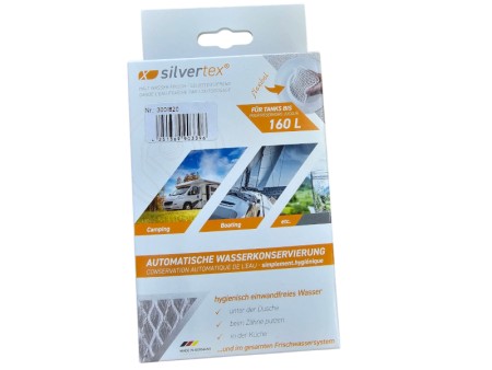Uzdatniacz i dezynfekcja do zbiorników wody czystej znajdujących się w przyczepach kempingowych lub kamperach. Silvertex chroni wodę w zbiorniku przed ponownym zanieczyszczeniem aż do 12 miesięcy, bez konieczności dozowania. Wkładamy gąbkę do zbiornika raz, natomiast przy każdym nowym napełnieniu wodą, gąbka automatycznie uwalnia jony srebra! Silvertex zapobiega tworzeniu się biofilmu, dlatego chroni nie tylko wodę, ale także cały system świeżej wody. Konserwację wody zapewnia automatyczne dozowanie czystych jonów srebra (bez nano srebra!) – składnika aktywnego zgodnego z normą DIN EN 15030.