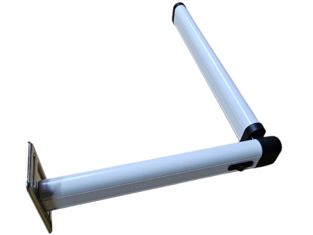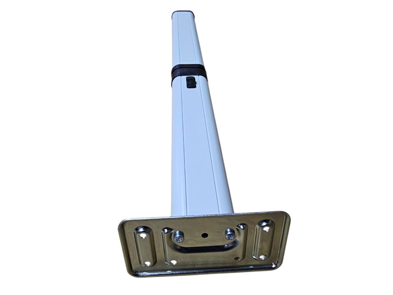 Noga podporowa stołu, blatu przyczepy składana renomowanej firmy Fawo. Wykonana z owalnej rury aluminiowej (50 x 25 mm), malowana proszkowo na kolor jasno szary. Możliwość ustawienia na dwóch wysokościach za pomocą przesuwnego przycisku. Noga idealnie nadaje się do zastosowania w blacie przyczepy kempingowej lub kampera. Dzięki składaniu nogi, z miejsca do siedzenia w łatwy sposób można stworzyć przestrzeń do spania.