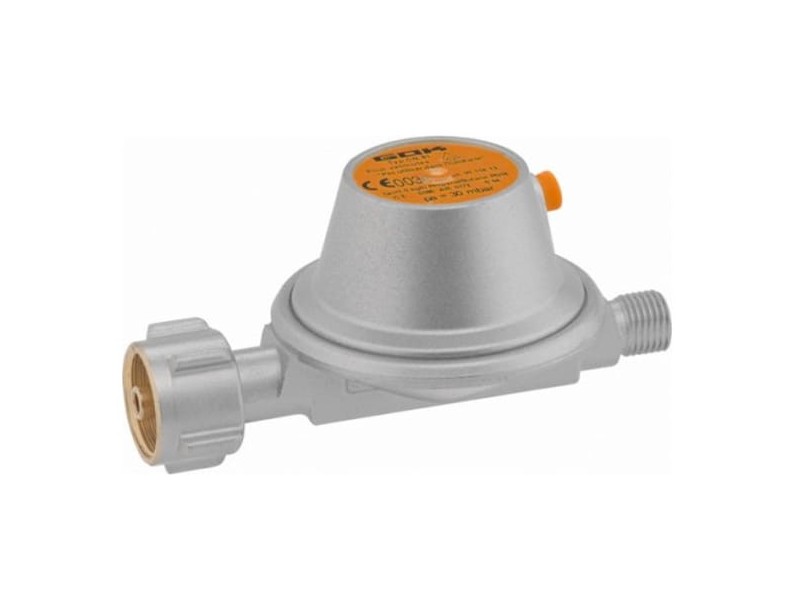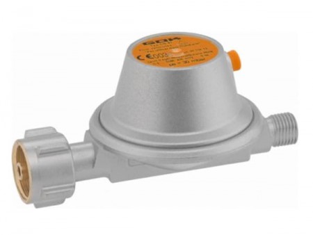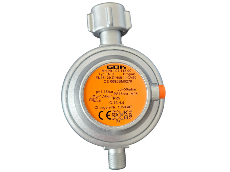 Jest to reduktor z atestem i zaworem bezpieczeństwa, oryginalny, renomowanej firmy GOK. Dedykowany do starszych przyczep kempingowych i kamperów, gdzie ciśnienie robocze instalacji gazowej wynosi: 50 mbar.